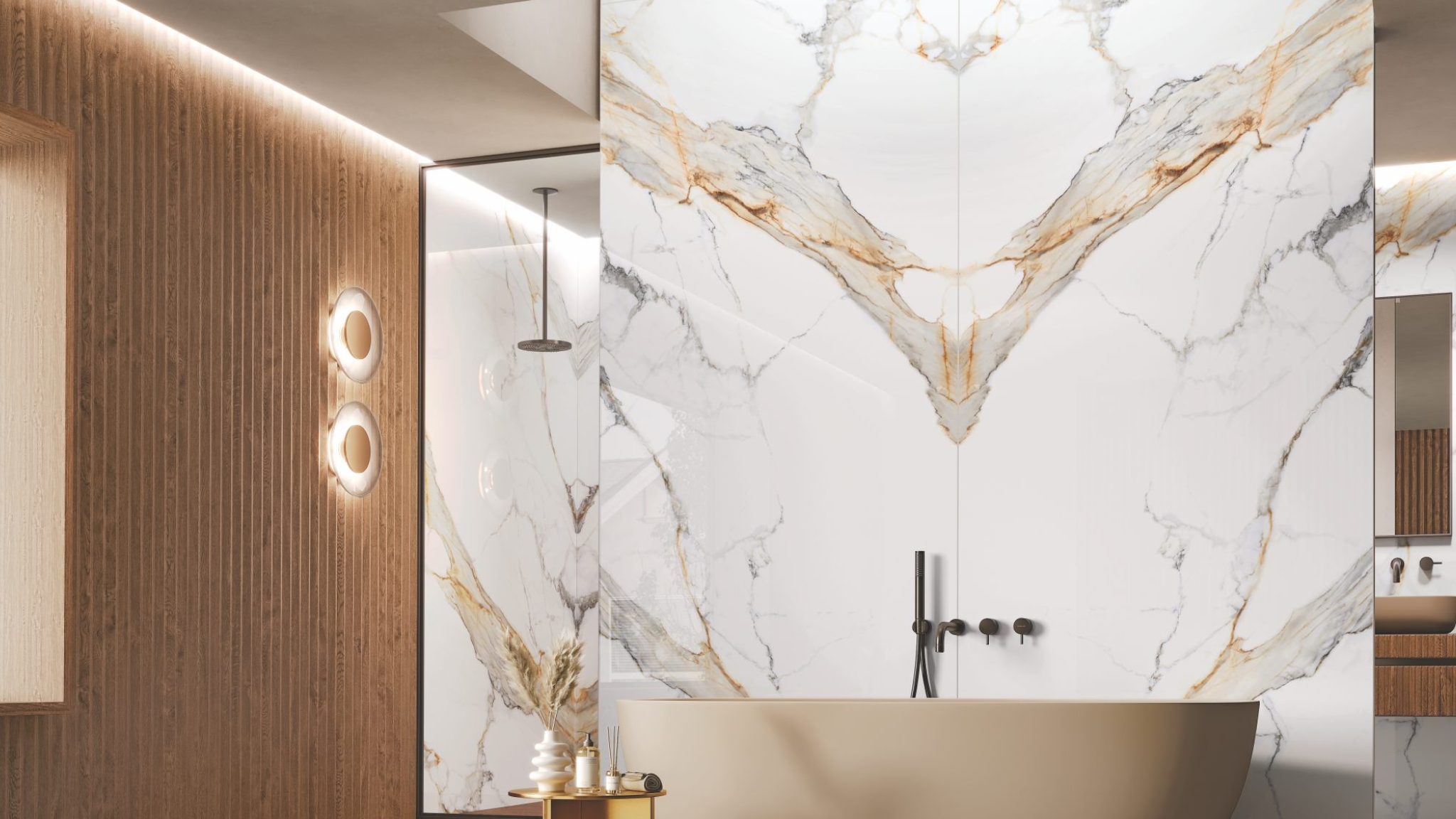 Calacatta Dorado dazzles with bold golden veining running across a luminous white background. With its dramatic yet harmonious composition, it reflects the grandeur of Italian marble, reimagined for interiors that crave both statement and subtlety.