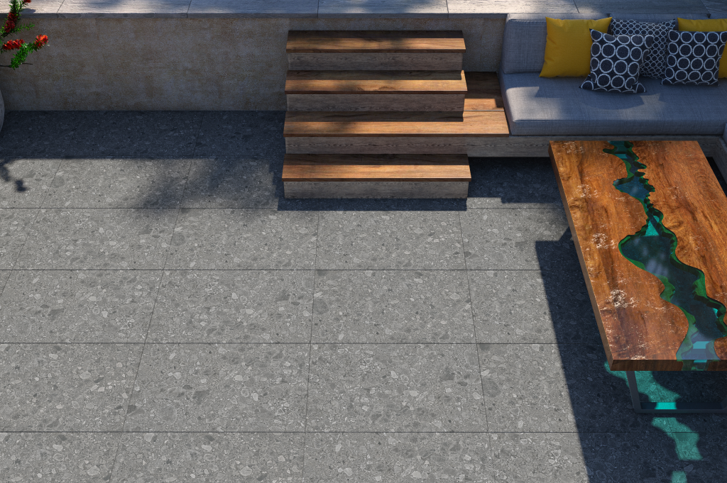 Ceppo Grey features embedded pebbles and grey aggregates, delivering a contemporary twist on terrazzo. A surface made for modern, minimal outdoor architecture.