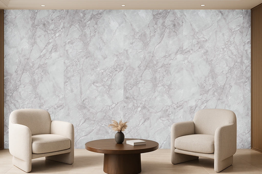Nimbus Grey blends soft storm-cloud tones with diffused linear movement, creating a surface that feels grounded and graceful. A perfect harmony of subtle energy and softness.
