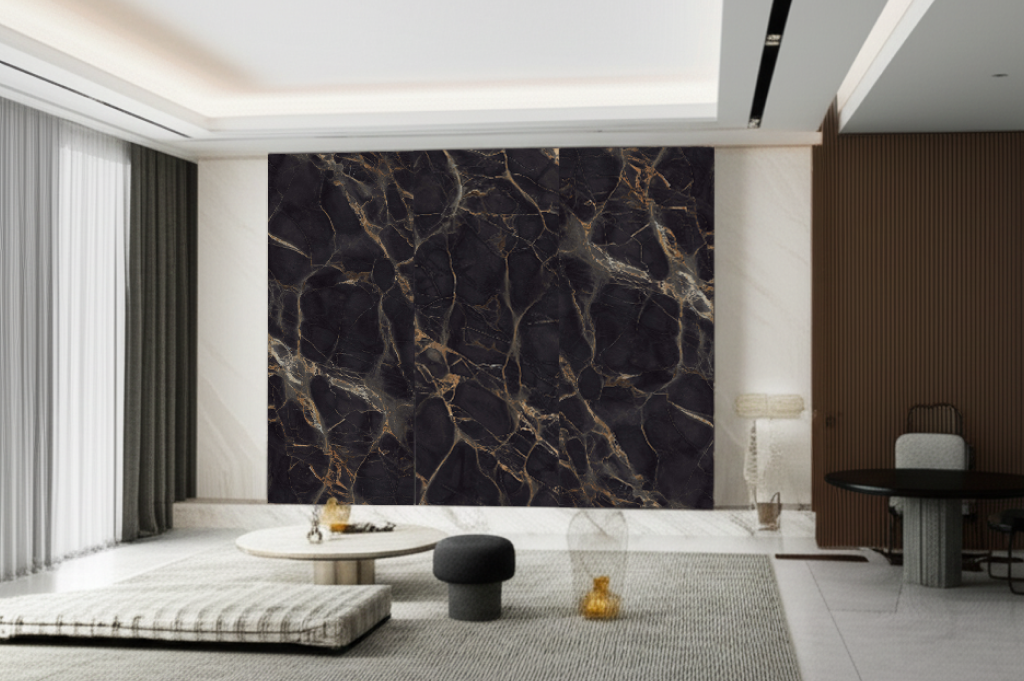 Nova Gold evokes richness through its dark backdrop and glowing golden vein structure. Its intricate pattern creates visual drama and lends itself to elevated interiors seeking bold contrast.