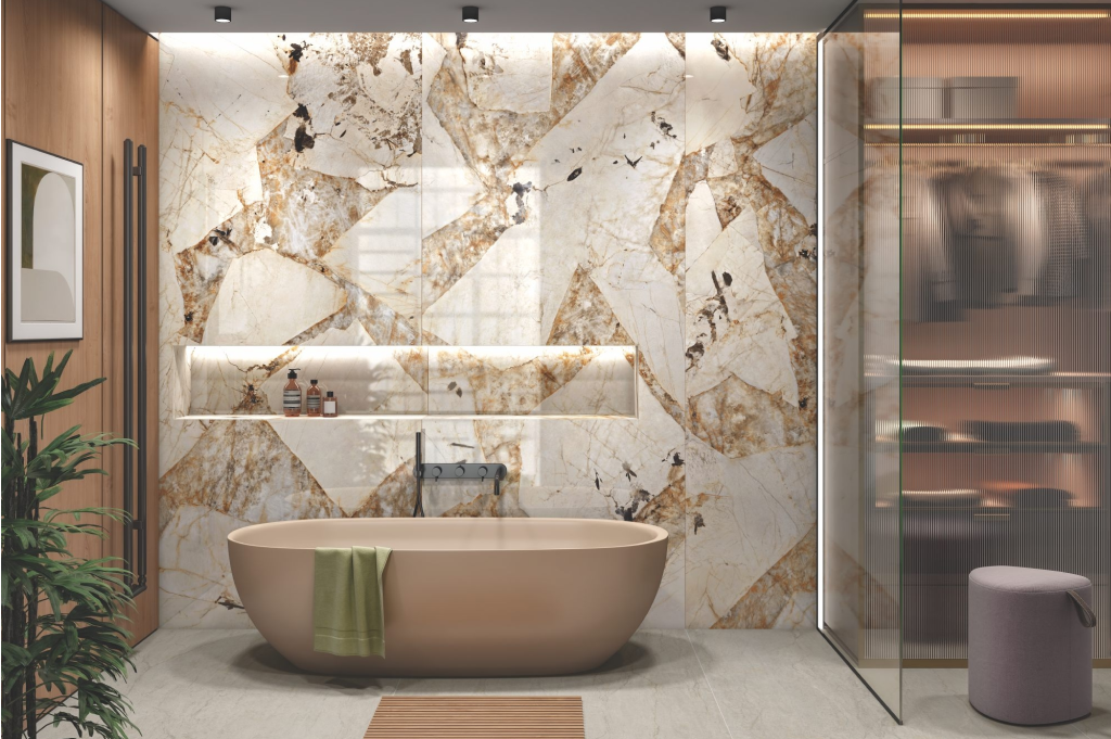 Patagonia Luxe features a bold collage of soft creams, caramel browns, and crystalline fragments. It's expressive layout creates visual richness, adding both character and movement to refined surfaces.