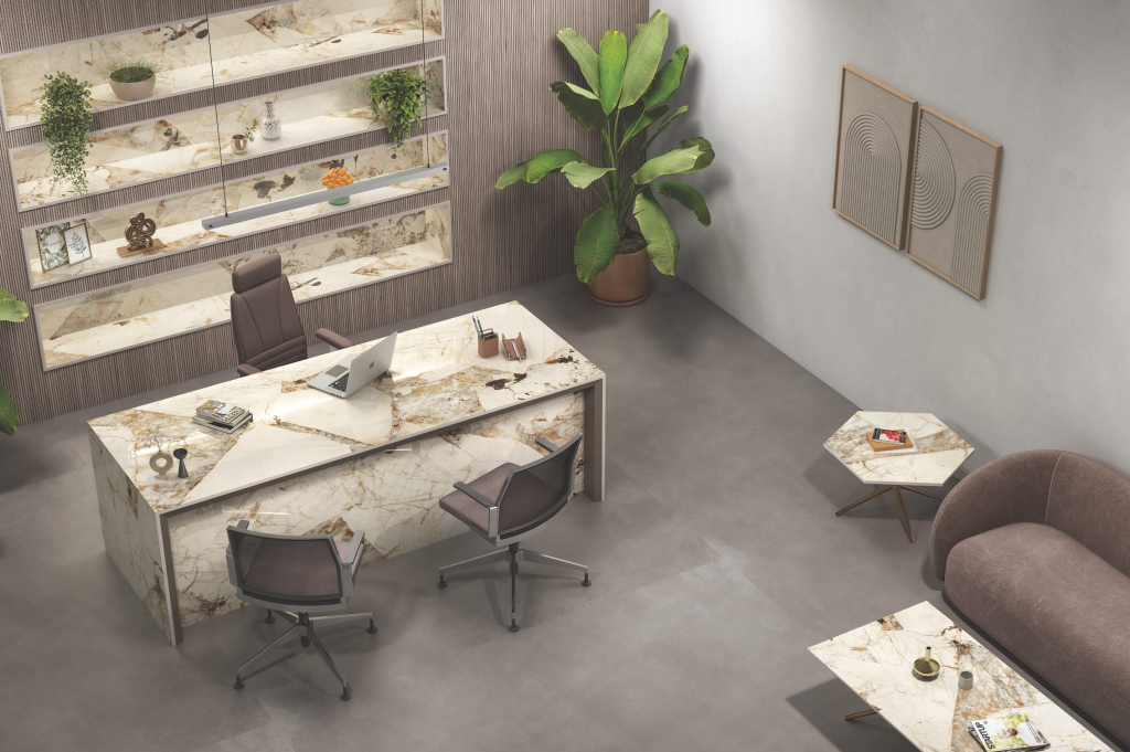 Patagonia Luxe features a bold collage of soft creams, caramel browns, and crystalline fragments. Its expressive layout creates visual richness, adding both character and movement to refined surfaces.