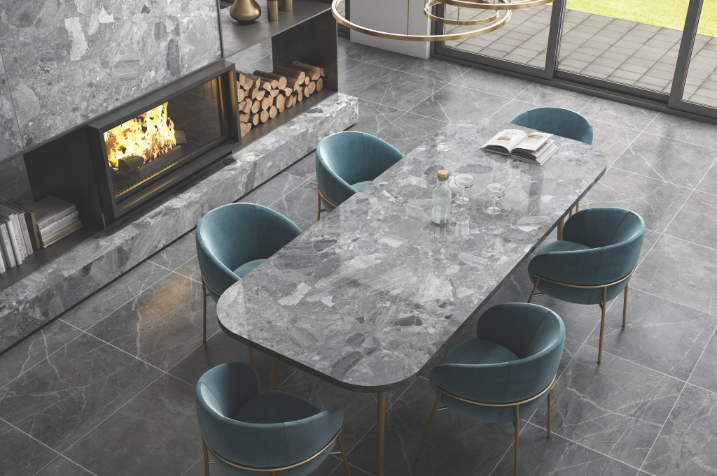 Tessera Gris is a dynamic blend of greys layered with angular stone fragments, creating a mosaic-like surface that feels raw yet refined. Its textured appearance brings depth to monochrome spaces.