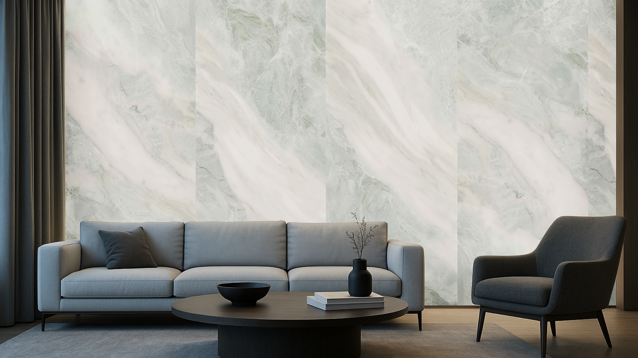 White Fantacy Onyx is a blend of misty whites and pale greens, with fluid, cloudy textures that create a dreamy and serene surface. Refined and expressive, it brings softness to bold design narratives.